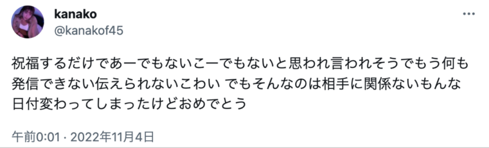 ただ、お祝いの投稿後半部分にも書かれている通り、Kanakoさん自身が匂わせを否定をしているため、意図的に匂わせしていた可能性は低いのかもしれません。