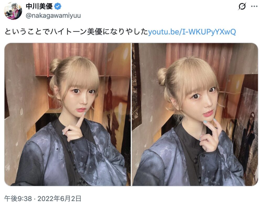 超特急ユーキさんのゲーム生配信匂わせ騒動後すぐに、中川美優さんはトレードマークであった黒髪をブリーチし、金髪にしたことを自身のSNSで報告しています。