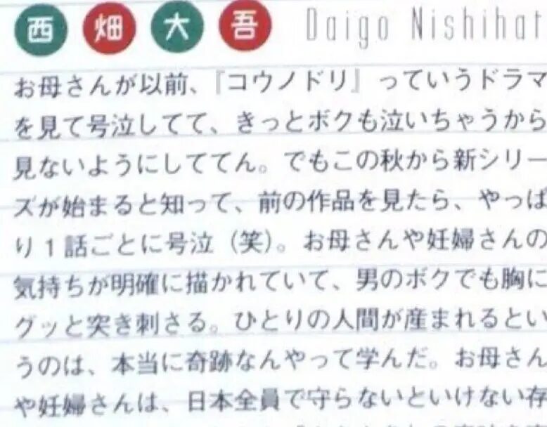 この『コウノドリ』について、西畑大吾さんとあかねさんが語っていた内容が重なって見えたことから「匂わせなのでは?」と話題になりました。