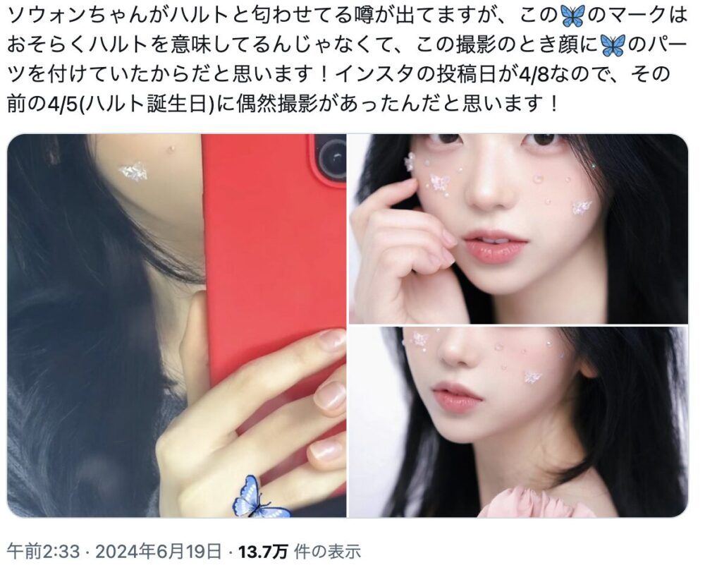 TREASUREハルトさんとソウォンさんの匂わせではないかという噂3つ目は、誕生日にインスタ投稿で蝶のスタンプです。