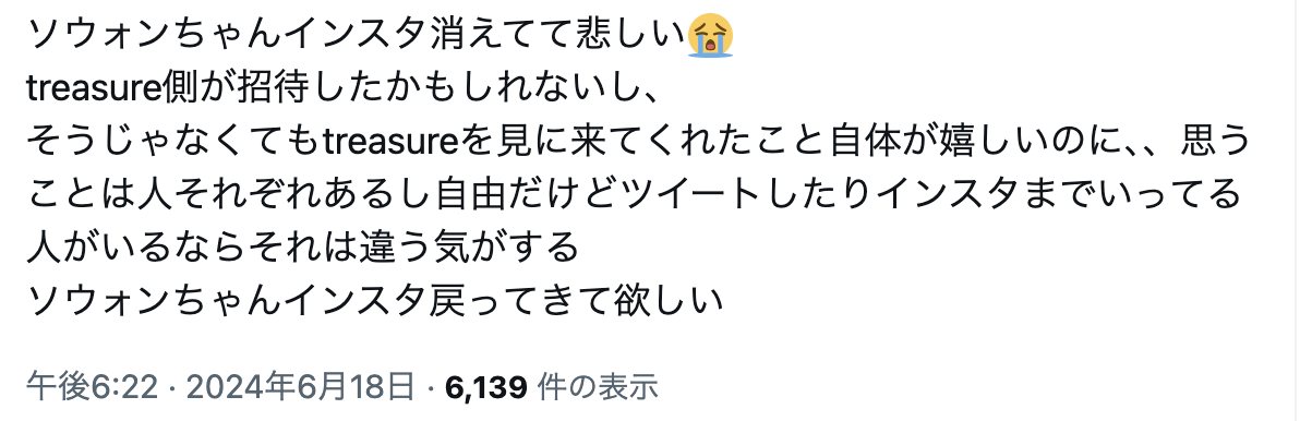 ただ、ソウォンさんがTREASUREのステージ後すぐに帰ったという情報は真偽不明のようなので、フェスへの参加自体を匂わせと断定するのは早いかもしれません。