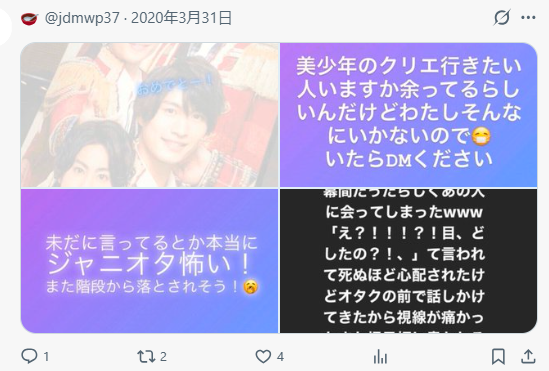 - 美少年のクリエ行きたい人いますか?→美少年とつながりがあることを示唆